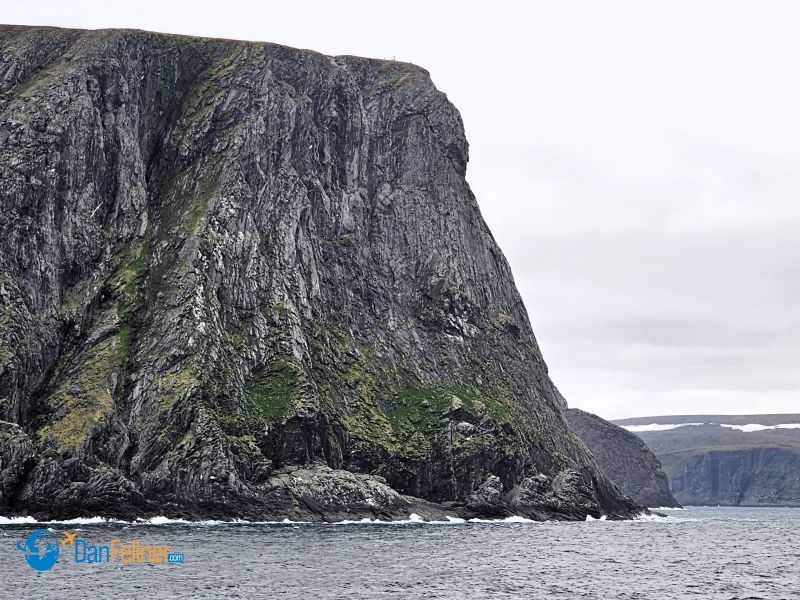 The view of the steep cliff at Nordkapp, which rises 1,007 feet above where the frigid waters of the Arctic and Atlantic oceans converge.